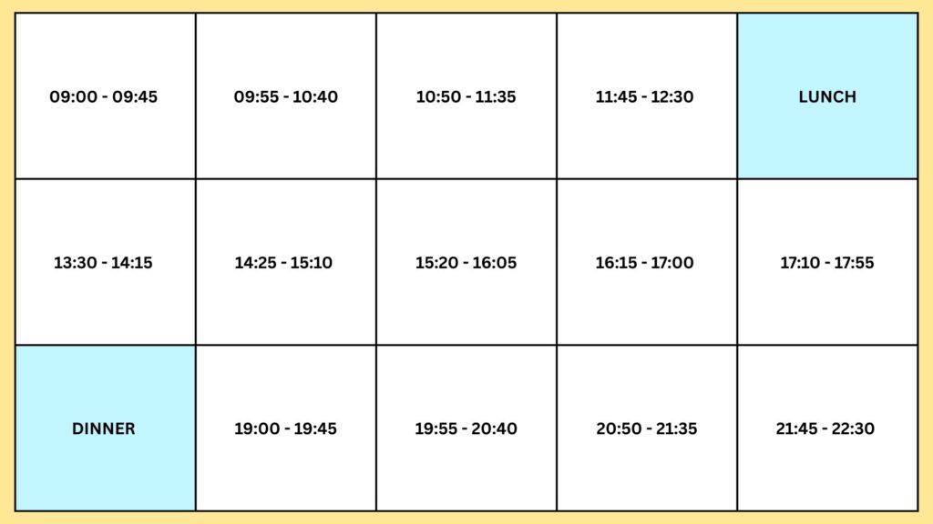Schedule 온라인 영어 수업: 주 5회 세션 (월요일부터 금요일까지)(주 2회 또는 주 3회 세션 일정은 별도 문의 바랍니다.) 온라인 영어 수업 비용: 20회 수업 – 300,000원 (약 US $220)